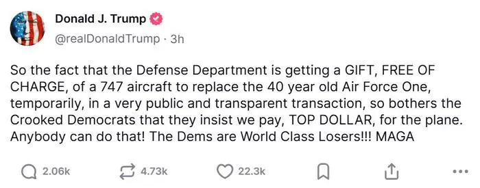 Den Berichten zufolge handelt es sich bei dem Flugzeug um ein Langstreckenflugzeug vom Typ Boeing 747-8. Trump schien die Berichte über sein Sprachrohr Truth Social zu bestätigen, erwähnte Katar aber nicht. Die Tatsache, dass das Verteidigungsministerium, eine 747 geschenkt bekomme, um die alte Air Force One zu ersetzen, störe die „korrupten Demokraten“, schrieb Trump. Sie bestünden darauf, dass die USA das Flugzeug bezahlten. „Das kann doch jeder! Die Demokraten sind Verlierer von Weltklasse!!!“