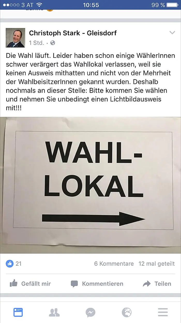 Aufregung gab es in der steirischen Stadt Gleisdorf: Dort wurden am Vormittag Wähler abgewiesen, weil sie keinen Lichtbildausweis vorweisen konnten und nicht allen Wahlbeisitzern bekannt waren. Darauf machte Bürgermeister Christoph Stark aufmerksam (siehe Eintrag 11:05 Uhr).