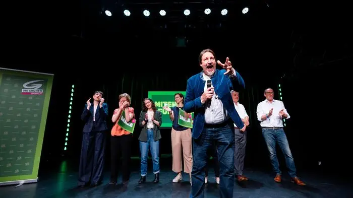 Zu Klängen der „Fantastischen Vier“, die Lautstärke nahe der Gesundheitsgefährdung, zogen die Parteioberen mit den Spitzenkandidaten ein, gingen in der jubelnden Menschentraube aber schnell unter. Mit Ausnahme von Thomas Waitz, dem Listenzweiten. Er ragte aber nicht nur ob seiner Körpergröße heraus, auch durch seine Rede, für die ausnahmsweise die abgeschmackte Zuschreibung „flammend“ passt. Er schrie den grünen Unterstützern aus der Seele.
