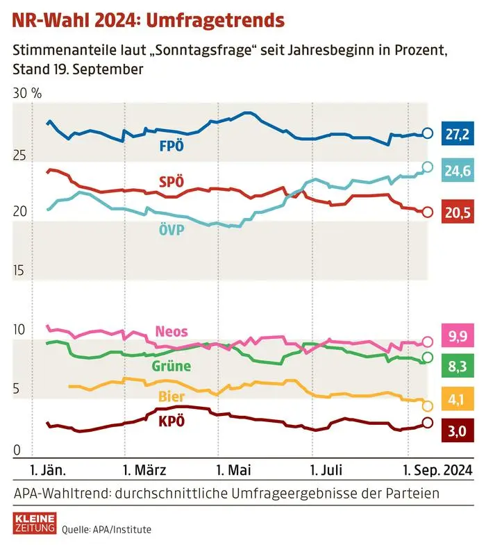 Kann Nehammer Kickl von Platz eins stoßen? Gelingt Babler eine Überraschung? Scheitern Bierpartei und KPÖ auf den letzten Metern? Der Wahlkampf biegt auf die Ziellinie ein.