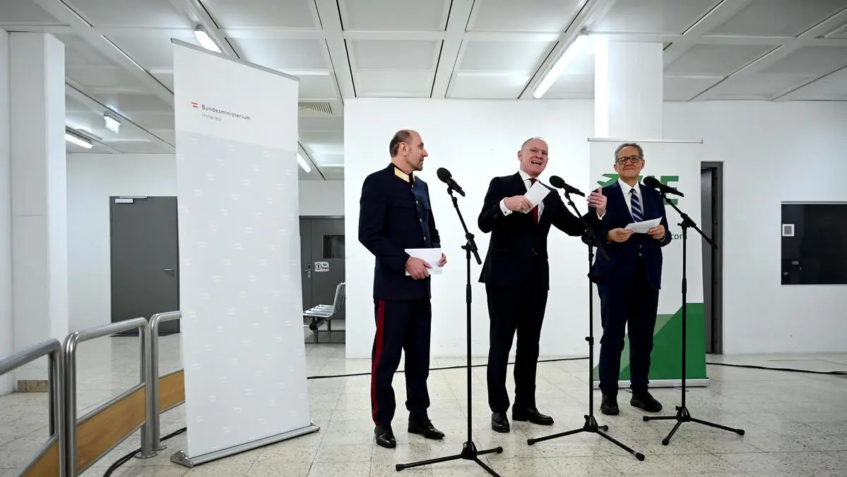 Innenminister Gerhard Karner (ÖVP) stellte mit Franz Ruf, Generaldirektor für die öffentliche Sicherheit, und Flughafen-Vorstand Günther Ofner den neuen Grenzterminal vor.