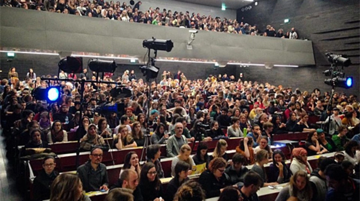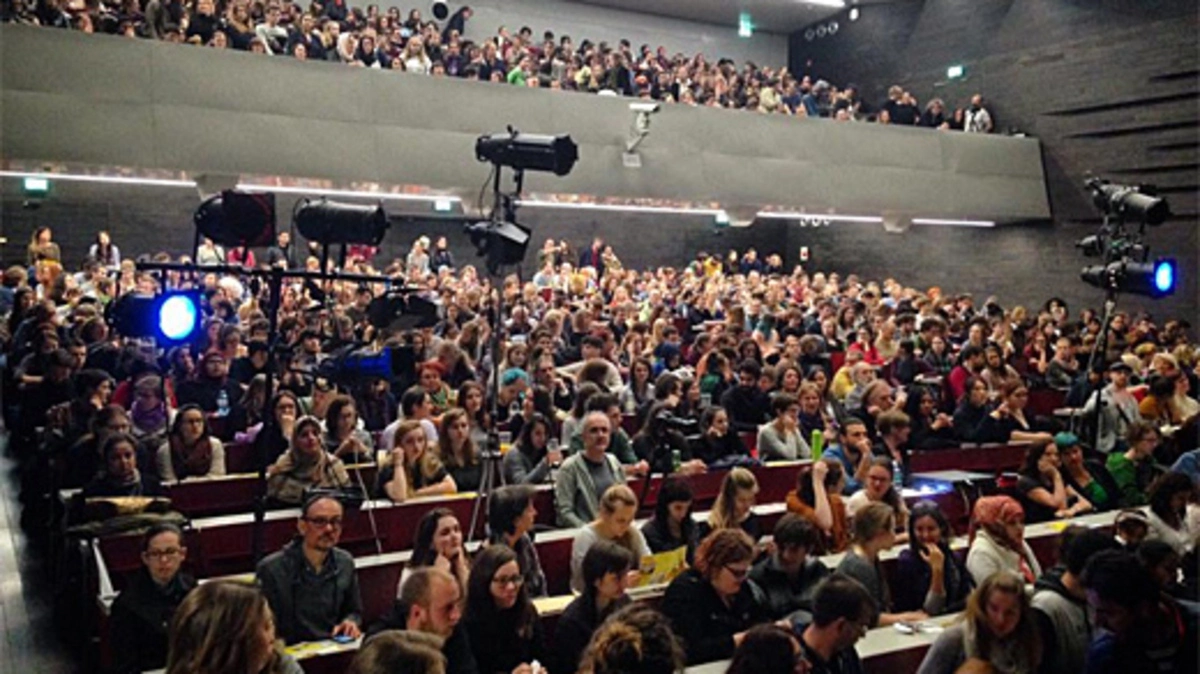 Das Stück "Schutzbefohlene performen Jelineks Schutzbefohlene" war Donnerstagabend im Wiener Audimax zu sehen. 20 bis 30 Identitäre stürmten die Bühne und bespritzten Menschen mit Kunstblut. In acht Fällen werde Anzeige wegen Körperverletzung erstattet, so die Polizei.