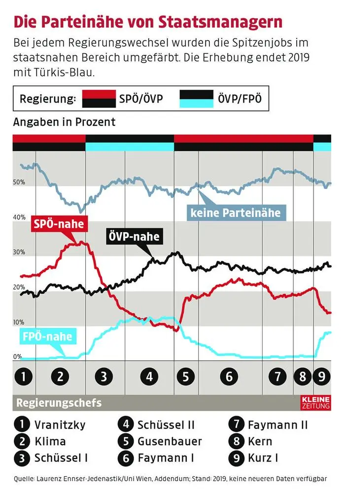 LAURENZ ENNSER-JEDENASTIK: Man sieht deutlich: Wenn die Farben in der Regierung wechseln, wechselt auch die Besetzung in den Vorständen und Aufsichtsräten. Sobald eine Partei in die Regierung kommt, die vorher nicht in der Regierung war, steigt ihr Anteil an diesen Posten. Wenn sie aus der Regierung ausscheidet, sinkt der Anteil. Mit den Daten, die wir gesammelt haben, kann man keine Einzelfälle beurteilen. Man sieht aber im Gesamtmuster, dass die Nähe zur Partei eine sehr große Bedeutung hat bei der Besetzung. Da stellt sich die Frage: Wie steht das im Verhältnis zu anderen Kriterien? Kann man viel Rücksicht auf Fähigkeiten und Expertise legen, wenn man so stark darauf fixiert ist, dass die Leute von der eigenen Parteifarbe sind?