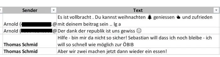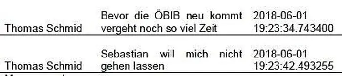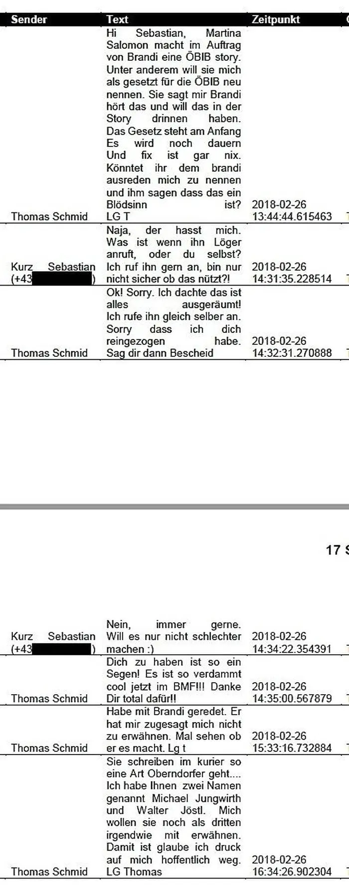 Schmid: "Hi Sebastian, (die Kurier-Journalistin, Anm.) Martina Salomon (...) will mich als gesetzt für die ÖBIB neu nennen. Sie sagt mir, Brandi hört das und will das in der Story drinnen haben. Das Gesetz steht am Anfang Es wird noch dauern. Und fix ist gar nix. (...)