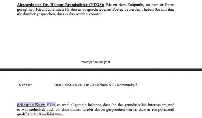 Konkret geht es um eine Befragung Kurz' durch den Neos-Abgeordneten Helmut Brandstätter am 24. Juni 2020. Nach einigem Hin und Her zur Besetzung des Kurz-Vertrauten als Chef der Staatsholding Öbag kam es dort zu diesem Austausch: