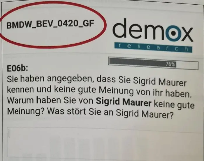 Die vorangegangene Befragung war dafür spannender: "Was stört Sie an Sigrid Maurer?" Diese Frage findet sich in einem Fragebogen aus April 2020, der im Titel das Bundesministerium für Digitalisierung und Wirtschaftsstandort (BMDW) anführt. Die Oppositionsparteien und die Grünen vermuten, ein zweites Umfrage-Tool der ÖVP auf Ministeriumskosten gefunden zu haben. Die ÖVP weist den Vorwurf zurück: Die Frage sei auf Kosten der Partei gestellt worden und nur vom Umfrage-Institut gleichzeitig abgefragt worden.
