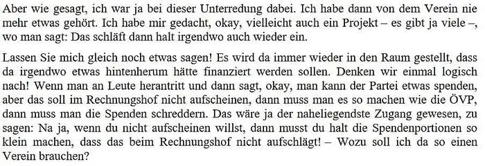Im von Jenewein aufgezeichneten Gespräch klang das etwas anders: "Wir haben uns damals mit dem Herbert Kickl im Bundesbüro zusammengesetzt", erzählte Tschank laut dem Aktenvermerk. Man habe gesagt: "Wenn man einen externen Verein gründet und der Verein hat einen eigenen Vereinszweck, das was nicht passieren darf ist, dass das Geld, wenn es dort einen Vereinsspender gibt, dass das Geld dann verwendet wird für Parteizwecke."