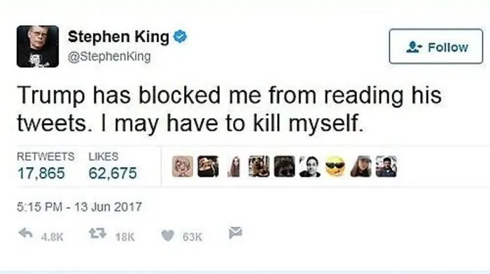 US-Präsident Donald Trump hat Autor Stephen King auf Twitter blockiert. Das teilte der Schriftsteller am Dienstag mit. Er ist nicht der einzige, von dem der Präsident nichts mehr wissen will.