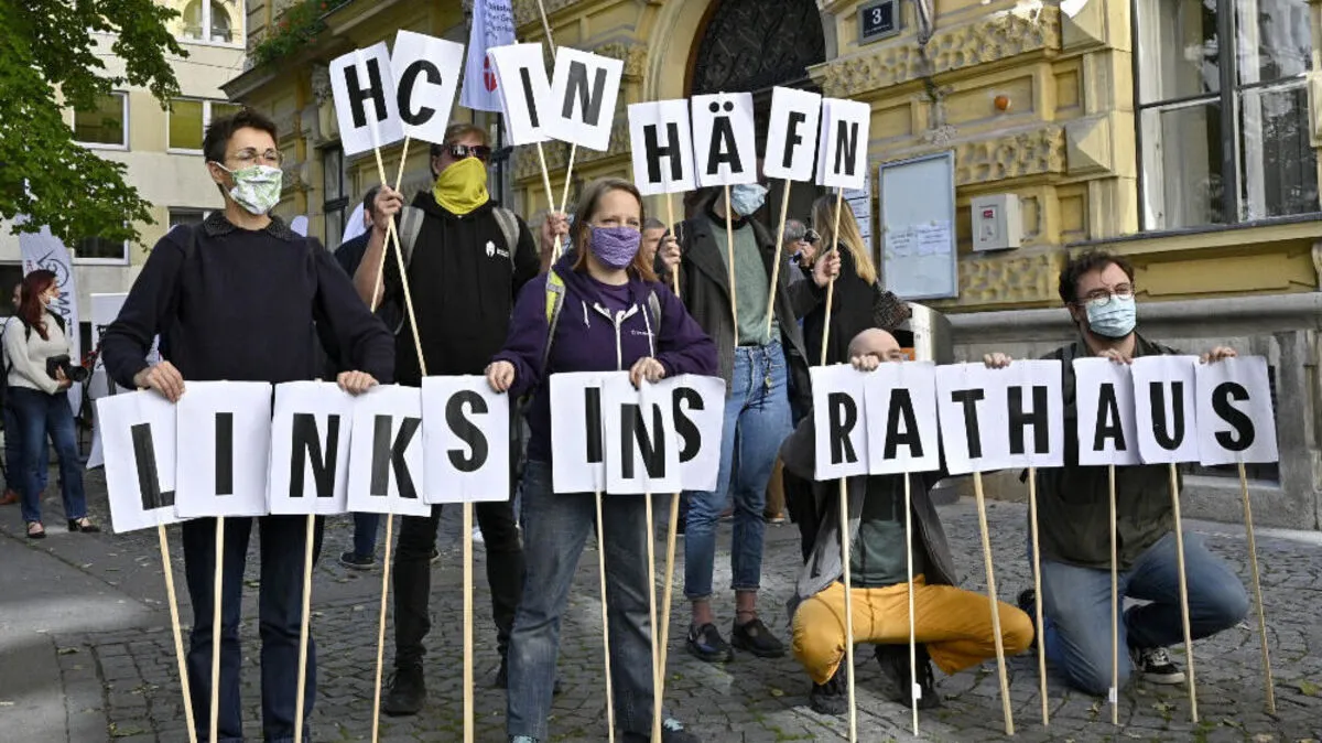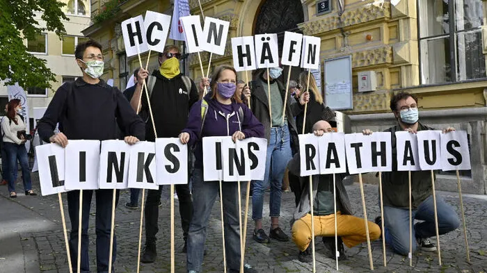 "HC in Häfn" forderten Anhänger der Partei Links bei der Briefwahl-Stimmabgabe des Ex-Vizekanzlers in Wien. Dieser bezeichnete die Gruppe als "Gesinnungsterroristen".