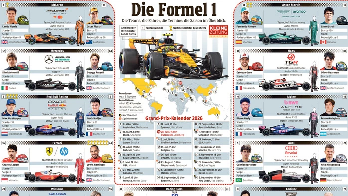 Die Formel 1 startet in die neue Saison: Alle Teams, Fahrer und Termine 2026 im Überblick.