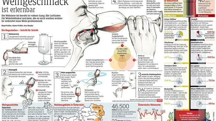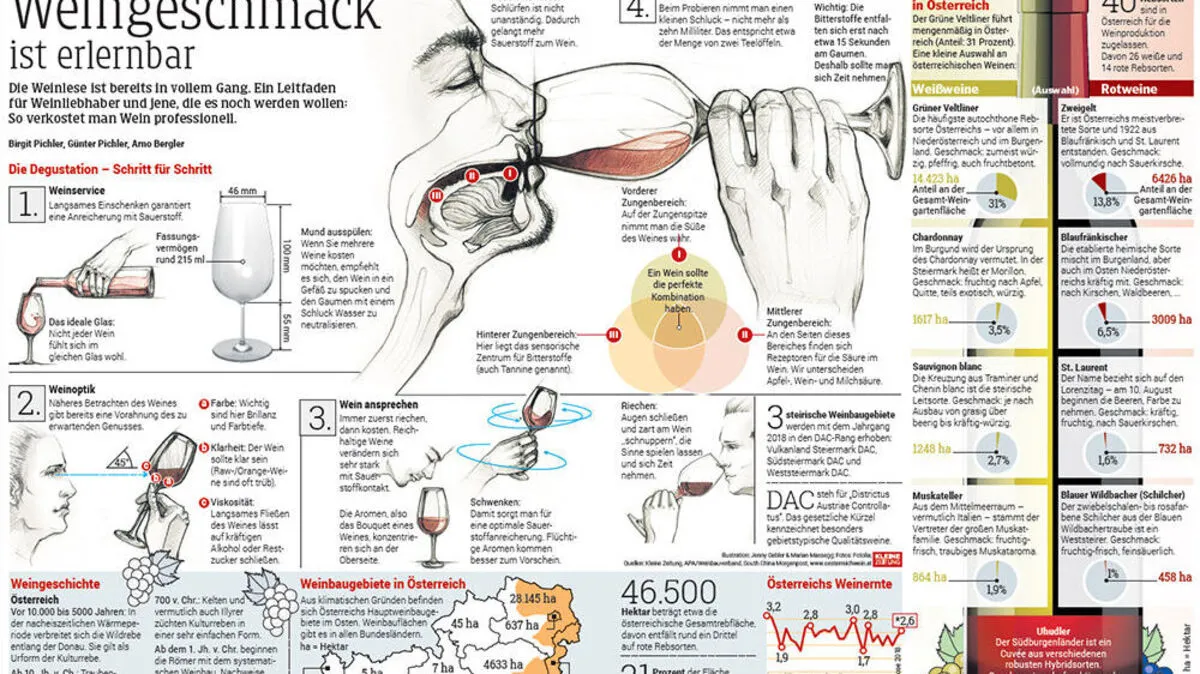 Die Weinlese ist bereits in vollem Gang. Ein Leitfaden für Weinliebhaber und jene, die es noch werden wollen: So verkostet man Wein professionell. Hier die Grafik als Pdf zur Ansicht.