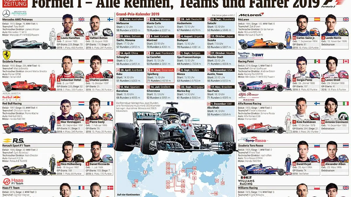 Der Rennkalender 2019 bietet alle Teams, alle Fahrer, die Autos sowie die Termine der Formel 1 auf einen Blick.