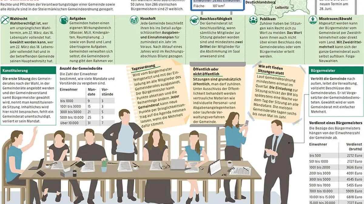 Am 28. Juni 2020 finden in der Steiermark die aufgrund der Corona-Pandemie verschobenen Gemeinderatswahlen statt. Alles, was Sie über einen Gemeinderat wissen müssen, erfahren Sie in dieser Infografik.