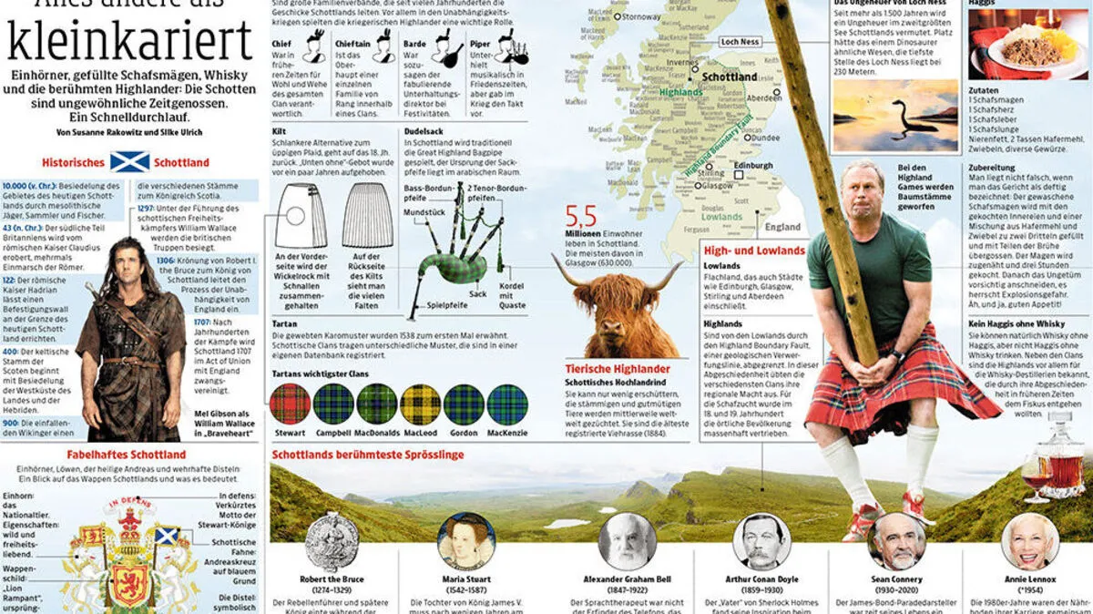 Einhörner, gefüllte Schafsmägen, Whisky und die berühmten Highlander: Die Schotten sind ungewöhnliche Zeitgenossen. Ein Schnelldurchlauf.
