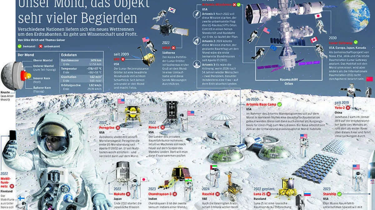 51 Jahre nach der letzten bemannten Mondmission liefern sich verschiedene Nationen ein neues Wettrennen um den Erdtrabanten. Es sind vielfältige Missionen mit wissenschaftlichem, aber auch kommerziellem Fokus.
