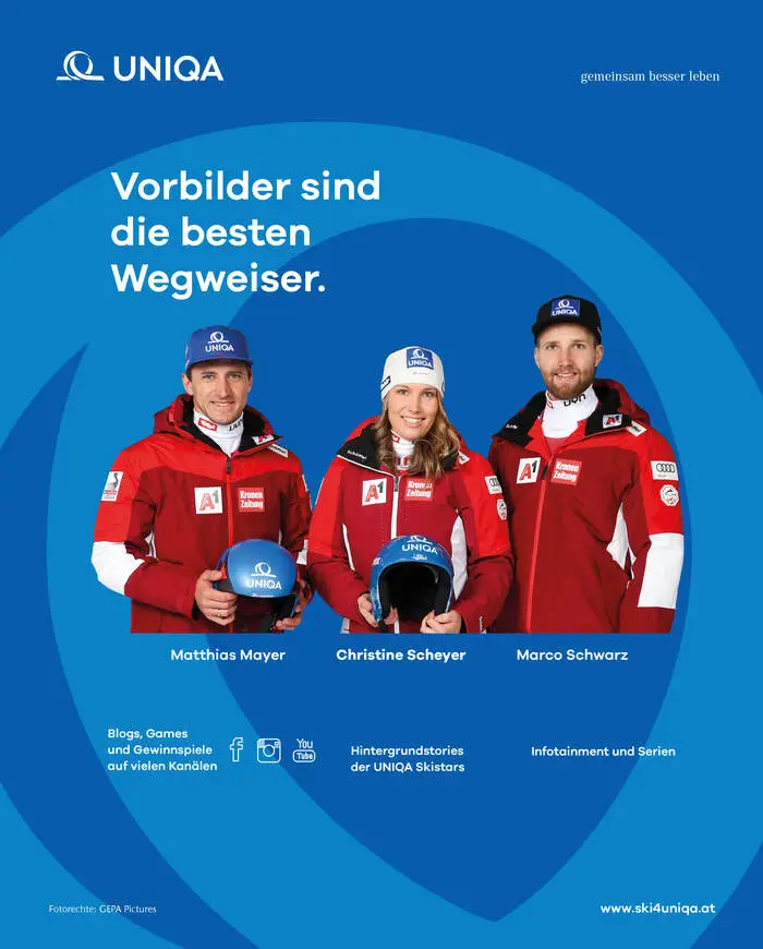 Aber auch die ehemaligen UNIQA Testimonials wie den 3-fachen Olympiasieger Matthias Mayer, Marlies & Benni Raich und sowie Stephan Eberharter treten immer wieder in Erscheinung.