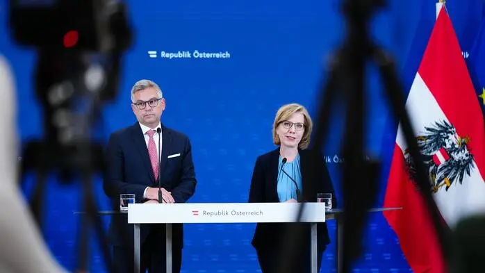 Finanzminister Magnus Brunner und Klimaschutzministerin Leonore Gewessler bei einer Pressekonferenz