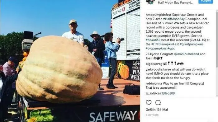 Im botanischen Garten von New York wird pünktlich zum Gruselfest Halloween der nach Veranstalterangaben größte Kürbis der Welt ausgestellt. Mit einem Gewicht von 1.071,8 Kilogramm sei die massive Frucht auch der größte jemals gewogene Kürbis in Nordamerika, teilte der New York Botanical Garden mit. Gezüchtet hatte ihn Joel Holland in der Nähe von Seattle im Staat Washington.