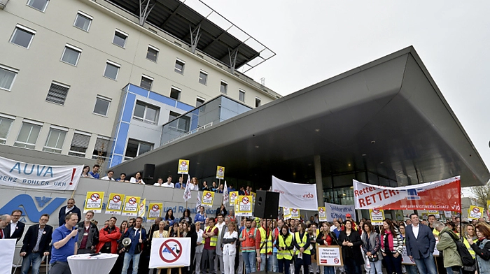 Anrainer und Patienten sind beim Unfallkrankenhaus Meidling am Donnerstagfrüh von Trillerpfeifen und Hupen geweckt worden. Anlass war jedoch kein Notfall - zumindest kein medizinischer. Gewerkschaft und Belegschaftsvertreter protestierten lautstark gegen eine drohende Auflösung der AUVA, die SPÖ unterstützte die Aktion mit einer Menschenkette um das Haus. Auch Streikdrohungen wurden geäußert.