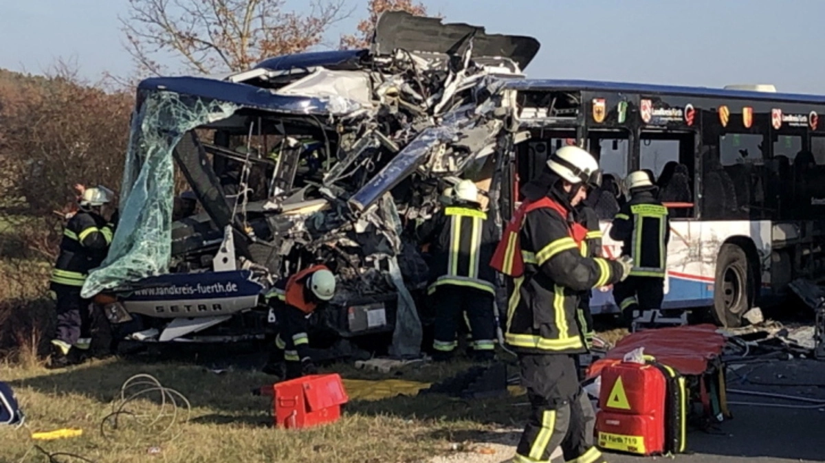 Bei einem frontalen Zusammenstoß zweier Linienbusse in Mittelfranken sind am Donnerstag etwa 40 Kinder und Erwachsene verletzt worden. Fünf davon wurden laut Polizei schwer verletzt und mussten mit Hubschraubern in Krankenhäuser gebracht werden. Die beiden Busse prallten demnach auf einer Verbindungsstraße zwischen Ammerndorf und Zirndorf im Landkreis Fürth zusammen.