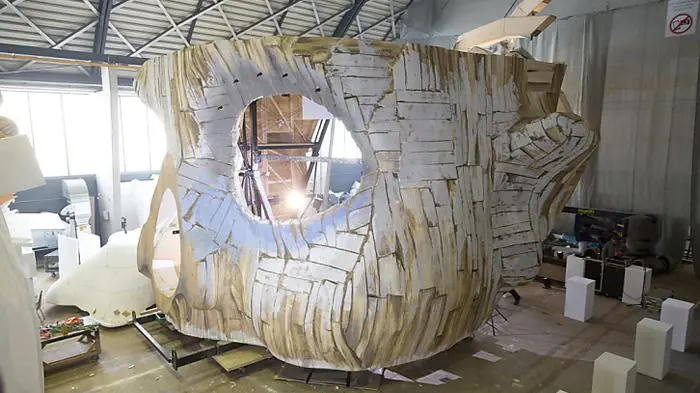 Vom Unterkiefer bis zur Schädeldecke misst der "Rigoletto"-Kopf mit einer angedeuteten Holzbretterstruktur rund 13,5 Meter, allein die noch leeren Augenhöhlen haben einen Durchmesser von 2,70 Meter. Bis zu 13 Personen sollten im Bühnenkopf Platz finden, verrieten die Verantwortlichen am Freitag in der Produktionsstätte. Die sogenannte "Hand Lindau" werde rund 11,5 Meter hoch, herausragende Kabel ließen erahnen, dass sie am Ende recht beweglich sein dürfte. Insgesamt sind am Bau des Bühnenbilds rund 40 Firmen beteiligt.