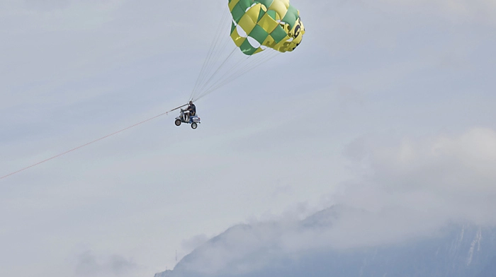 Ein 41-Jähriger aus Steyr ist am Samstag bei Strobl (Flachgau) mit einer Vespa an einem Drachen aus einer Höhe von 75 Metern in den Wolfgangsee gestürzt. Der Mann wollte einen Weltrekord aufstellen und die größte Höhe mit einem Drachen dieser Art erreichen, wie er selber angab. Plötzlich drehte der Wind und er prallte aufs Wasser. Der Oberösterreicher überstand das Abenteuer unbeschadet.