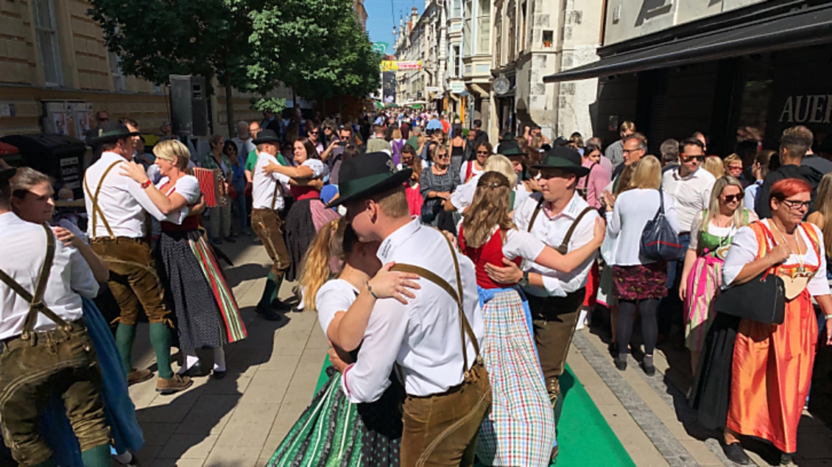 Strahlend blauer Himmel und jede Menge Tracht: Beim 18. Aufsteirern in Graz war am Sonntag alles serviert für ein wahres Volksfest. Bei den Besuchern wurde mit rund 130.000 ein neuer Rekord aufgestellt, so Organisator Markus Lientscher. Die meisten kamen in Lederhose und kariertem Hemd oder im Dirndl, nicht nur um das Brauchtum zu pflegen, sondern für gute Tropfen und zünftige Jausen.