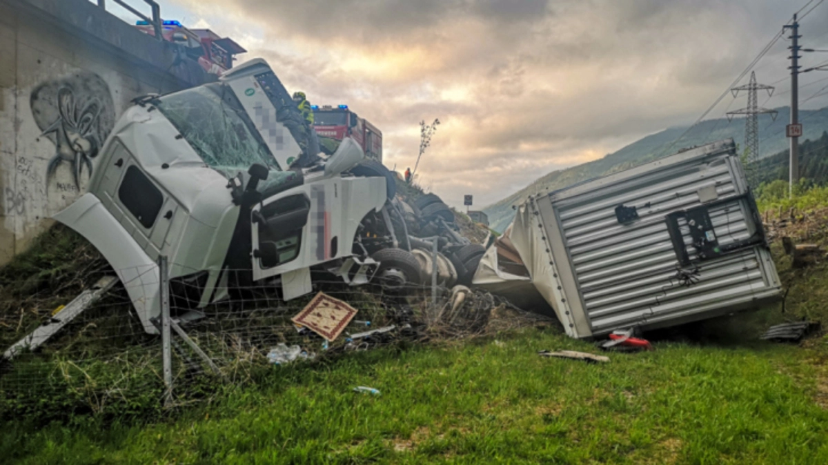 Ein Lkw ist Donnerstagfrüh auf der Pyhrnautobahn (A9) nahe Kalwang in der Obersteiermark in einem Baustellenbereich auf die Gegenfahrbahn geraten, gegen einen Brücke geprallt und anschließend rund sechs Meter tief über eine Böschung abgestürzt. Der Fahrer wurde verletzt, konnte sich aber selbst aus dem völlig zerstörten Schwerfahrzeug befreien, hieß es seitens der Feuerwehr.