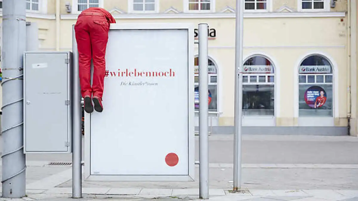 Mit Plakaten mit dem Schriftzug "#wirlebennoch/Die Künstler*innen" verweist der Künstler "donhofer" auf die prekären Umstände der Kulturschaffenden in Österreich angesichts der Coronakrise. Die Plakate sind laut Aussendung vom Montag nun flächendeckend in Wien und in der St. Pöltner Innenstadt zu sehen.