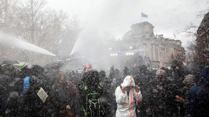 Die Polizei hat bei Protesten gegen die deutsche Corona-Politik nahe dem Reichstagsgebäude in Berlin Wasserwerfer eingesetzt. Die Einsatzkräfte begannen am Mittwochmittag mit dem Besprühen der Menschen, nachdem diese mehrfach zum Gehen aufgefordert worden waren. Journalisten berichteten auch von Rangeleien und dem Einsatz von Tränengas. Demonstranten schrien und pfiffen mit Trillerpfeifen.