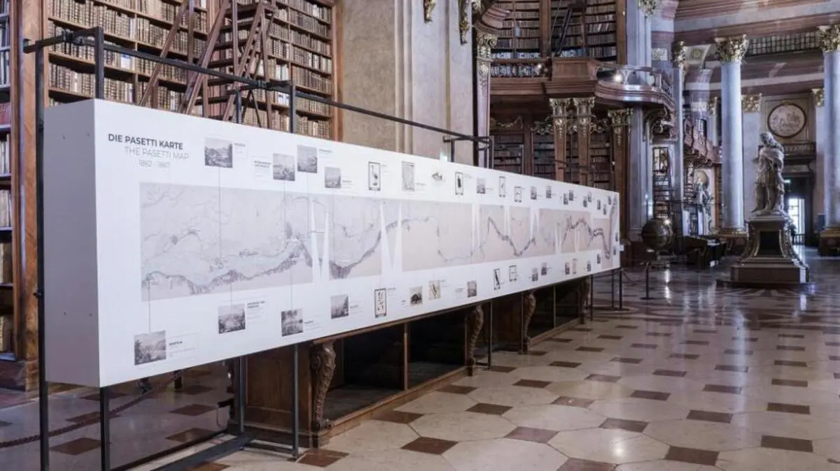 Vieles hat sich an ihren Ufern bereits abgespielt: Die über 2.800 Kilometer lange Donau steht im Mittelpunkt einer neuen Sonderausstellung der Österreichischen Nationalbibliothek (ÖNB). Mit "Die Donau. Eine Reise in die Vergangenheit" kehrt das Haus kommende Woche aus dem Lockdown zurück, und die Präsentation im Prunksaal hat für die Besucher so einiges zu bieten - allen voran eine 44 Meter lange Reproduktion der berühmten Pasetti-Karte.