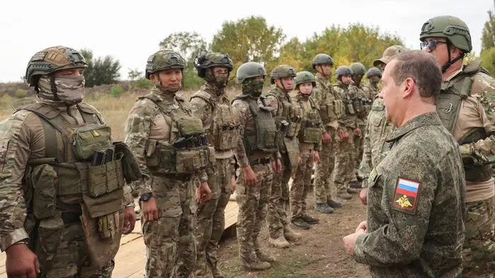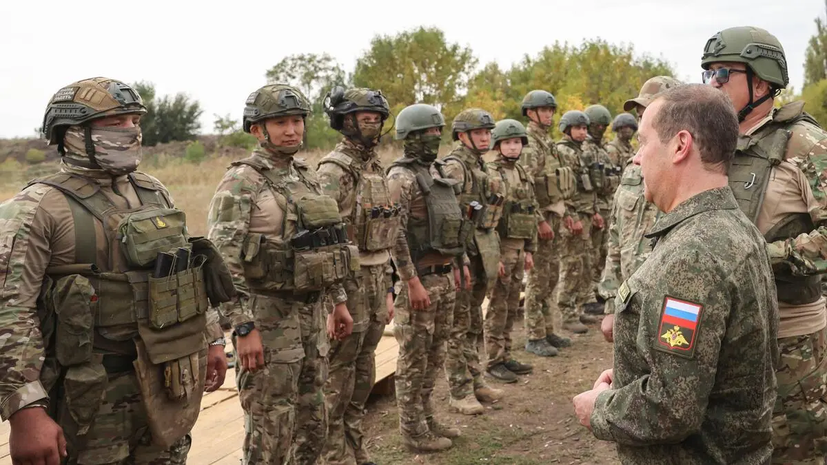Der stellvertretende Vorsitzende des russischen Sicherheitsrates Dmitri Medwedew besucht Soldaten im Oblast Donezk in der Ostukraine.  | Der stellvertretende Vorsitzende des russischen Sicherheitsrates Dmitri Medwedew besucht Soldaten im Oblast Donezk in der Ostukraine. (15. September 2023)