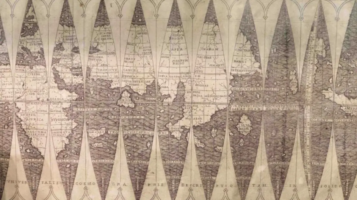 Auf 12 Streifen hat Boulengier die gesamte Weltkugel dargestellt. "America" erscheint als "neu entdeckt" - lateinisch "noviter reperta"- ganz im Osten in der Nähe Japans, da der Pazifik noch unbekannt war, als zwickelähnliche Fläche mit vielen unbekannten Inseln umgeben.