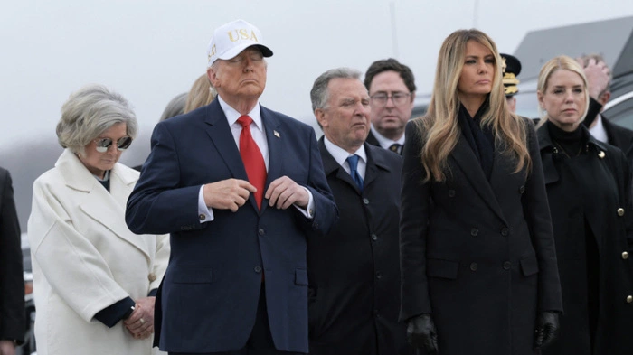 US-Präsident Donald Trump hat am Samstag (Ortszeit) mit Ehefrau Melania und Vertretern seiner Regierung an der Überführung der sechs im Iran-Krieg getöteten US-Soldaten teilgenommen. Am Luftwaffenstützpunkt Dover im US-Bundesstaat Delaware traf er auch die Familien der Gefallenen. "Es ist ein sehr trauriger Tag", sagte er im Anschluss. Inmitten zumeist schwarz gekleideter Gäste stach Trump auch deshalb hervor, weil er eine weiße Baseball-Kappe mit der Aufschrift "USA" trug.