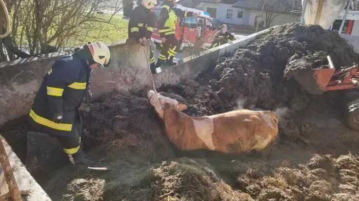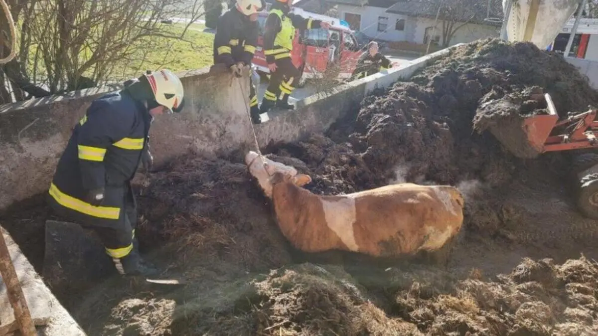 Kuh "Ludi" war Mittwochfrüh in Lasberg-Edlau (Bezirk Freistadt) bis über den Bauch in einen Misthaufen eingesunken und stecken geblieben. Die Freiwillige Feuerwehr Lasberg wurde daher gegen 7.45 Uhr zur Rettung gerufen. Zusammen mit der Landwirtin und ihrem Partner gelang es mit einem Hoftrac die Kuh soweit von den Fäkalien zu befreien, dass sie dann "in einem gemeinsamen Kraftakt schließlich befreit werden konnte", so die Feuerwehr.
