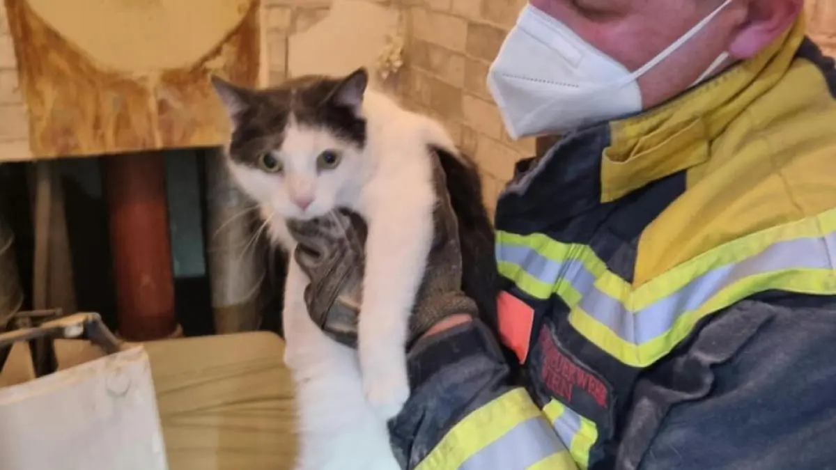 Die Katze steckte zwischen Rohren und einer weiteren Wand fest. Die Rohre mussten mit einem hydraulischen Spreizer vorsichtig von der Wand weggedrückt werden, um die eingeklemmte Katze zu befreien. Anschließend konnte sie wieder ihrem Besitzer übergeben werden.
