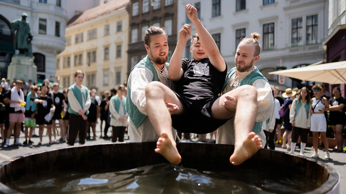 Vor dem Gutenbergdenkmal beim Lugeck in der Wiener Innenstadt sind am Freitag Absolventinnen und Absolventen "Der Graphischen" einem ebenso traditionsreichen wie nassen Brauch in der Druckbranche unterzogen worden: Beim Gautschen - seit 2021 Immaterielles UNESCO-Kulturerbe - wurden die sogenannten Kornutinnen und Kornuten in einen Wasserbottich getaucht. Damit sollen, so die Legende, Fehler der soeben zu Ende gegangenen Ausbildungszeit abgewaschen werden.