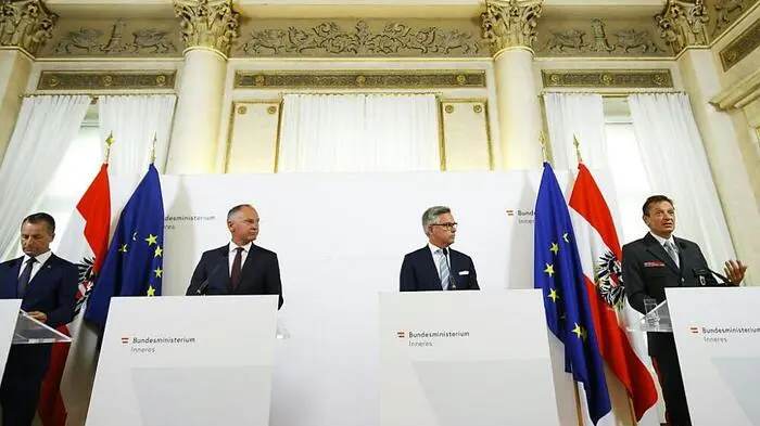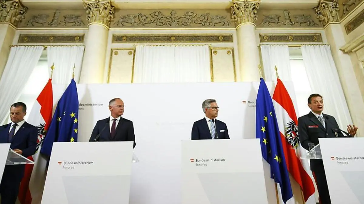 Der Leiter der Zentralstelle zur Bekämpfung der Schlepperkriminalität Gerald Tatzgern, Innenminister Gerhard Karner, Finanzminister Magnus Brunner und der Leiter der Finanzpolizei Wilfried Lehner