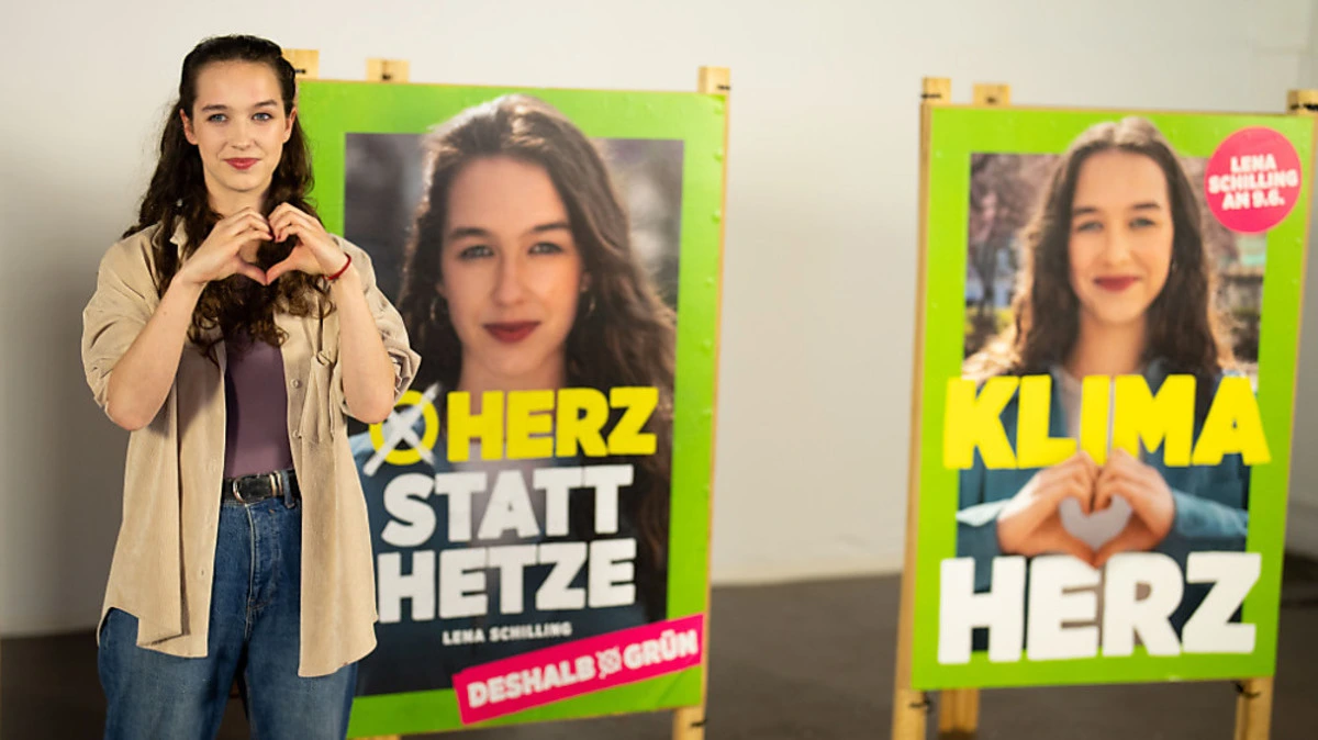 Das Herz ist in Mode. Nach der "Herz und Hirn"-Kampagne der SPÖ setzen nun auch die Grünen auf das Liebessymbol. Die vier am Donnerstag präsentierten Plakat-Sujets für die EU-Wahl zieren eine lächelnde Spitzenkandidatin Lena Schilling mit Slogans, die sich um das Herz drehen: "Herz statt Hetze", "Europa braucht Herz", "Klima-Herz" und "Klima braucht Herz."