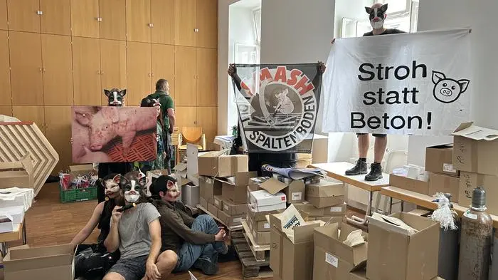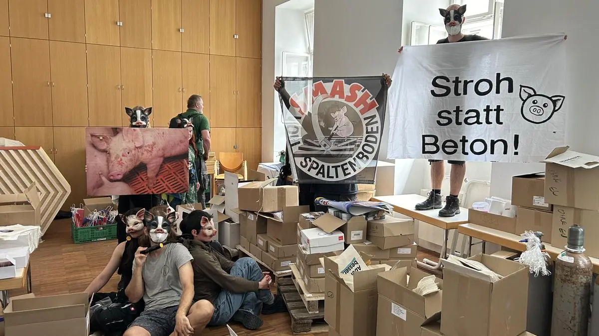 Die vermummten Aktivisten waren am Vormittag mit Schweinemasken in das Gebäude gestürmt und hatten sich in einem Zimmer im Erdgeschoss verbarrikadiert. Die ÖVP wollte der Forderung nach einem Treffen mit Totschnig nicht nachkommen.
