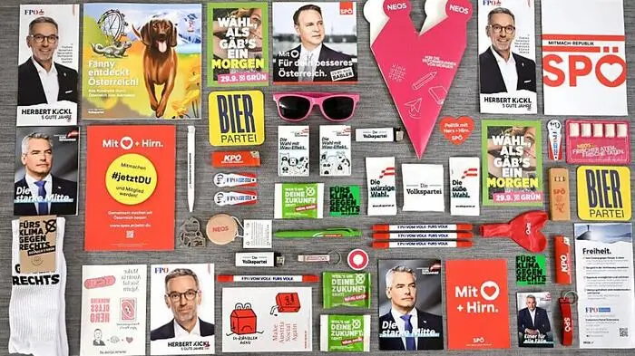 Im Nationalratswahlkampf umwerben die Parteien die Wählerinnen und Wähler auch diesmal wieder mit kleinen Geschenken und Werbematerial. Neben den Klassikern Kugelschreiber, Stofftaschen und Naschereien sind bei dieser Wahl auch kreativere Werbeartikel darunter. So werden etwa Hunde-Leckerlis, handgefertigte Holzherzen, Socken und Aufklebe-Tatoos von den Parteien im Wahlkampf verteilt.