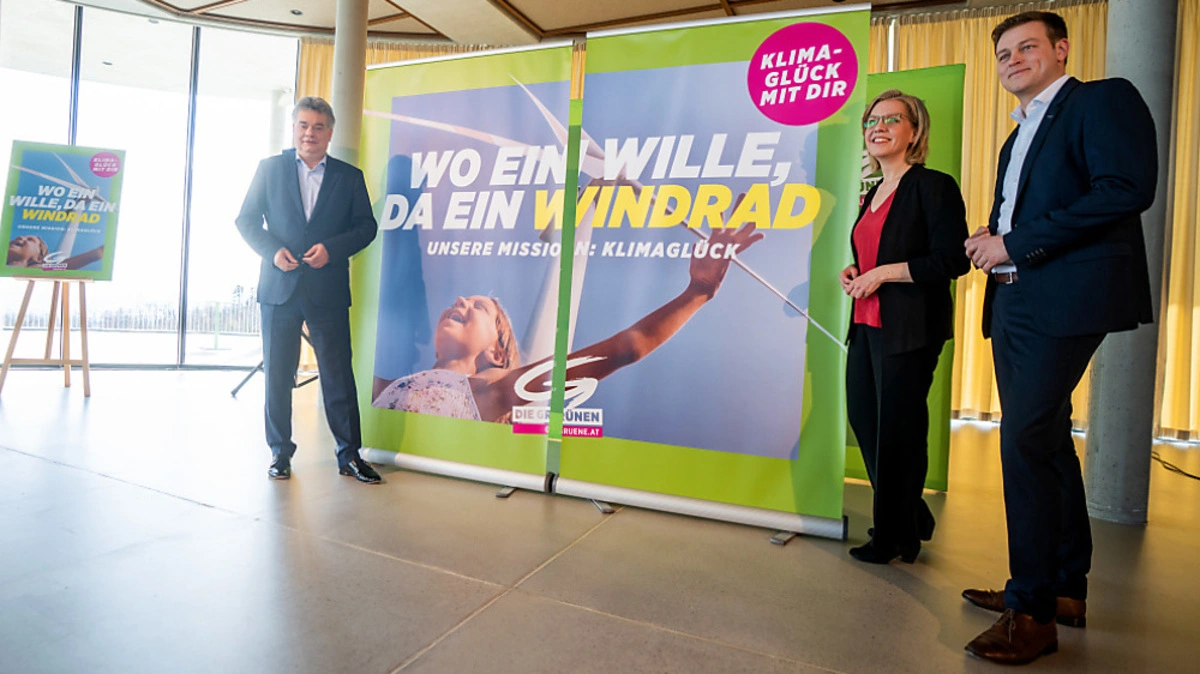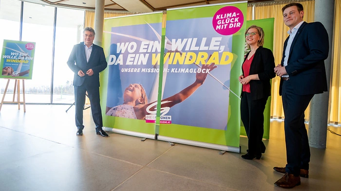 Die Grünen setzen in ihrer Frühjahrskampagne auf ihr Kernthema. Unter dem Motto "Mission: Klimaglück" soll von 13. bis 26. März ein Radiospot und eine Social Media Kampagne für den Klimaschutz werben. Bei der Präsentation am Wiener Cobenzl zeigten Bundessprecher Werner Kogler und seine beiden Stellvertreter Leonore Gewessler und Stefan Kaineder eines von mehreren Sujets her: "Wo ein Wille, da ein Windrad" wird ab kommender Woche unter anderem in U-Bahnstationen zu lesen sein.