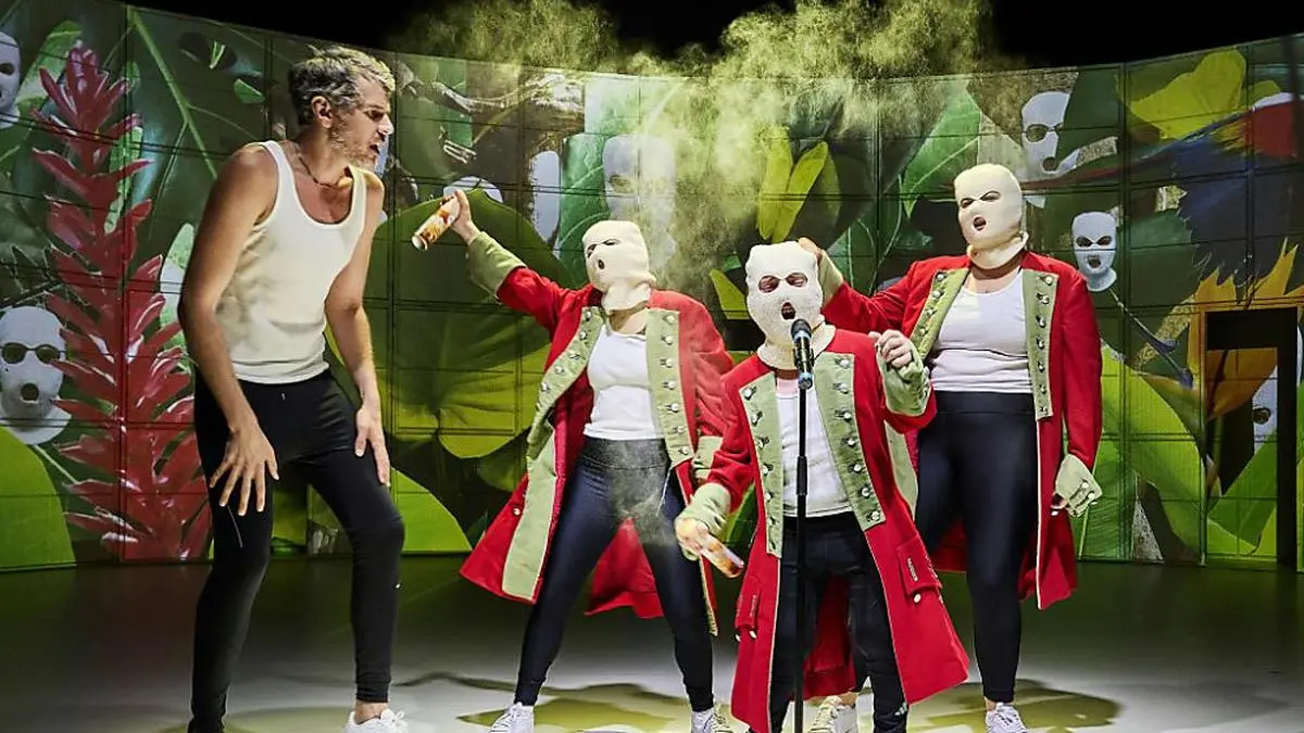 Aber nicht nur. "Nehmt und trinkt, wer weiß, wie lange noch was da ist", heißt es im Text, der auch vom Ressourcenverbrauch, dem Artensterben und der Klimakrise handelt. Bevor der Autor Gefahr laufen kann, belehrend zu wirken, kippt er sein Stück ins Surreale und formt assoziative Bilder, die er mit Claudia Carus, Johanna Hainz, Sophie Hewig, Benjamin Kornfeld, Sascha Schicht und Valentin Späth umsetzt, die sich bestens auf den permanenten Rollenwechsel, auf Tanzen oder gar Beatboxen verstehen und farbenreich deklamieren.