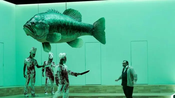 Hierbei nimmt der 49-Jährige die Tür-auf-Tür-Spiele des Genres bei den Hörnern und hält verschiedene Stellwände bereit, deren einzige Accessoires Türen sind, die entsprechend ausgiebig genutzt werden. Alles in allem konterkariert Michieletto die Bräsigkeit des Materials mit stilvollem Minimalismus - wenn man vom optischen Rufzeichen eines beweglichen Riesenbarschs absieht, der rechtzeitig zur den ersten Akt beschließenden Albtraumsequenz von der Decke hängt.