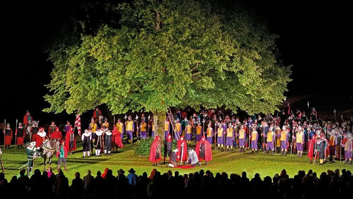 Zwei Jubiläen prägen heuer die Frankenburger Würfelspiele: Vor 400 Jahren fand das Blutgericht am Haushamerfeld statt, vor 100 Jahren wurde das traurige Geschichtsereignis erstmals als Volksschauspiel "Das Frankenburger Würfelspiel" aufgeführt. Mehr als 500 Laienschauspielerinnen und -schauspieler erwecken das makabere Spiel erneut zum Leben. Am 25. Juli ist Premiere auf der Natur-Freilichtbühne in Leitrachstätten.