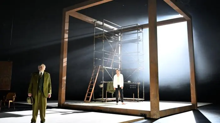 Nach der Pause entfaltet der zunächst so euphorisch begrüßte Krieg seine volle Grausamkeit, der geheimnisvolle Kubus wird nach und nach zum Gerippe. Pařízek zelebriert die Unsagbarkeit mit dem exzessiven Einsatz des Vorhangs, der das Publikum nicht nur einmal zum vorzeitigen Schlussapplaus verleitet. In kurzen Szenen, in denen der Vorhang gefährlich die Mitte der Bühne erreicht, geben die Protagonist:innen noch einmal alles. Das blutig erkaufte Ende einer Ära deutet sich an. Am Ende steht Ratlosigkeit, wie mit dem neuen Zeitalter umzugehen ist.
