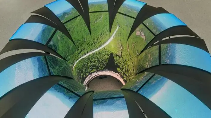 Auf den ersten Blick erinnern sie an Brunnen: Unterschiedlich hohe Zylinder, die sich an ihren Rändern jedoch wie Blüten in den Raum ausbreiten. Darauf zu sehen sind Drohnen-Aufnahmen aus dem Inneren eines historischen Wehrturms in der so genannten Spanischen Mark auf der Iberischen Halbinsel. Die beiden Skulpturen sind das Herzstück der Ausstellung "Feudal Holes" der spanischen Künstlerin Claudia Pagès Rabal, die ab Donnerstag im mumok zu sehen ist.