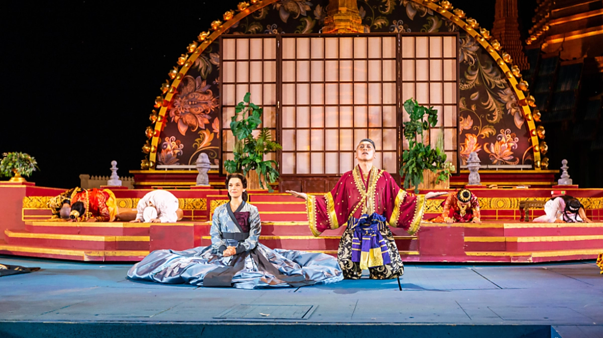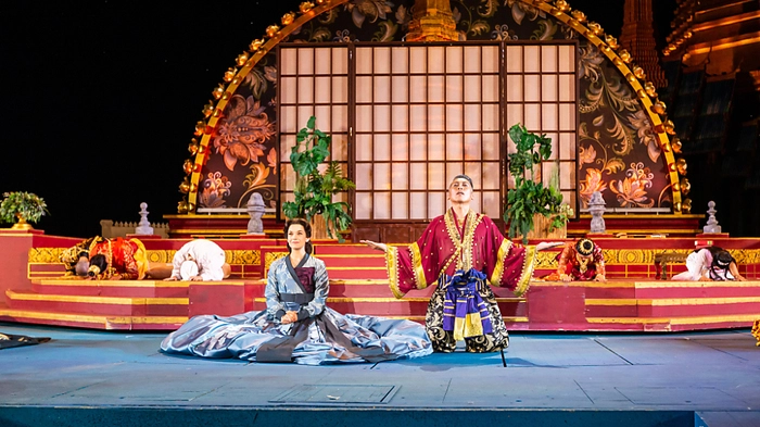 Der Wettergott hat es mit den Seefestspielen gut gemeint: Blieb es während der Open-Air-Premiere von "Der König und ich" trocken, ergoss sich kurz darauf Platzregen über die Mörbischer Sommernacht. Vor der nassen Heimreise sah man am Donnerstag ein Musical, das in der Bühnengestaltung nicht mit Reizen geizte. Simon Eichenbergers Inszenierung um eine Engländerin am siamesischen Hof bleibt leicht verdaulich und unterhaltsam, leidet im zweiten Akt aber unter ihrer Länge.