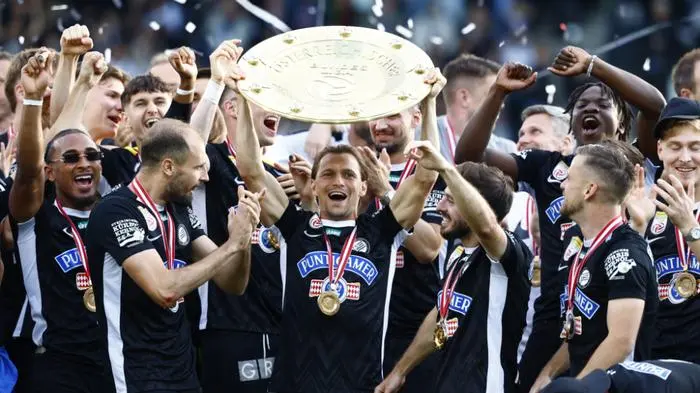 In Graz folgte am Abend eine rauschende Party: Um 19.35 war der Meisterteller in den Händen von Stefan Hierländer. Der Sturm-Kapitän erhielt die Trophäe in der Merkur Arena aus den Händen von Franco Foda, der mit den "Blackys" selbst als Spieler und Trainer Meister geworden war. Es folgte Obligatorisches: Aus den Stadionlautsprechern erklang "We are the Champions", über die Spieler ergoss sich ein Konfettiregen. Schon davor hatte es Bierduschen gegeben.