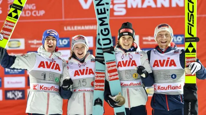 Das österreichische Team hat zum Auftakt der Skisprung-Weltcupsaison in Lillehammer im Mixedbewerb Rang drei erreicht. Julia Mühlbacher, Stefan Kraft, Lisa Eder und der starke Schlussmann Jan Hörl mussten sich am Freitag nur Japan und Olympiasieger Slowenien geschlagen geben, die 10,1 bzw. nur 1,2 Punkte vor ihnen lagen. Deutschland landete 31,5 Zähler hinter Österreich an der vierten Stelle, Weltmeister Norwegen musste sich mit Platz fünf begnügen.
